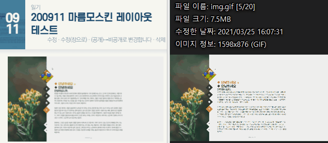 - 썸네일로 움짤을 사용하는데, 해당 스킨 코드에서 지정한 크기보다 gif의 가로 세로 폭 크기가 클 때