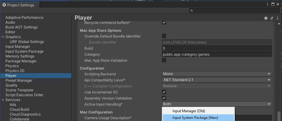 그다음 Edit > ProjectSettings > Player로 가서 Active Input Handling을 찾아 시스템을 Input System Package로 바꿔준다.