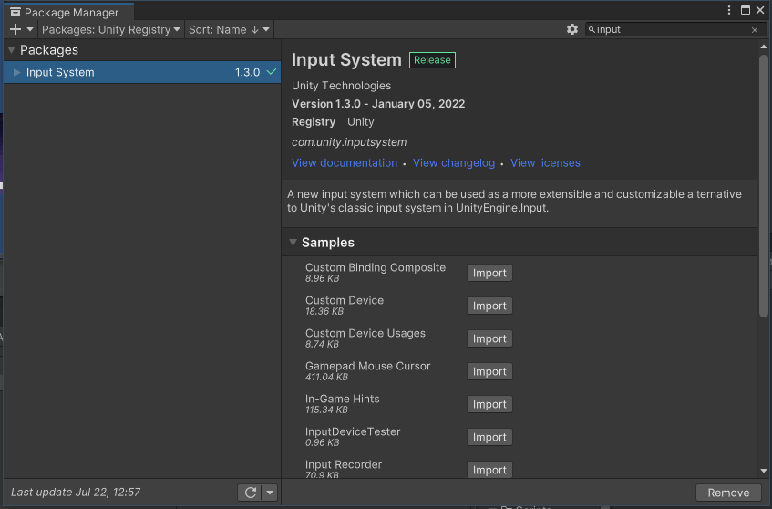 우선 Window > Package Manager 로 가서 좌측 위 Packages를 Unity Registry로 설정한 후, Input System을 찾아주자.
