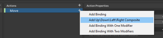 Action Properties - Action - Action Type를 Value, Control Type를 Vector2로 한다.