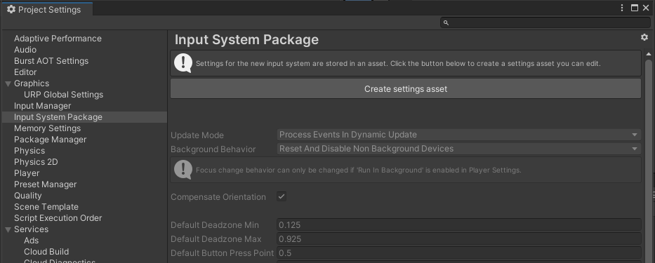 마지막으로 프로젝트 세팅의 Input System Package로 가서 Create settings asset을 눌러준 다음,
