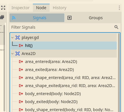 이 작업을 통해 우린 Player 내부에 "hit"이라는 이름의 커스텀 시그널을 정의해 줬다.