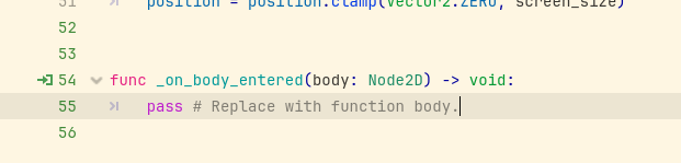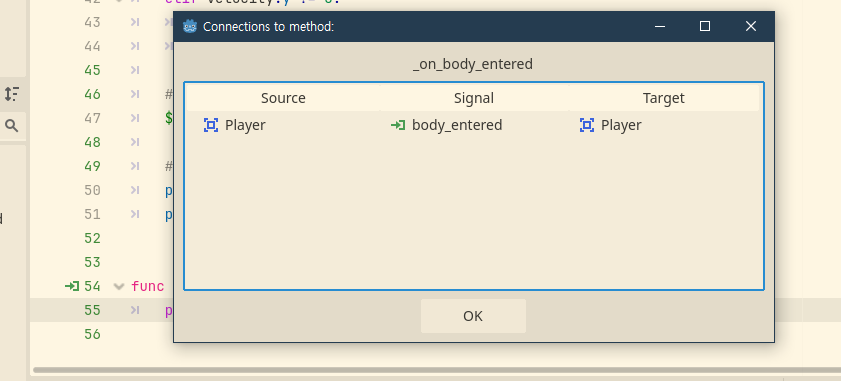 줄 번호 옆에 있는 초록색 아이콘을 보자. 이건 이 함수가 signal과 연결되어 있다는 뜻이다. 다시 말해, 이 함수는 기존 함수들처럼 스크립트 작성자가 자유롭게 호출할 수 있는 함수가 아니라, 게임 내에서 특정 상황이 발생하면 자동으로 실행되어주는 함수다.