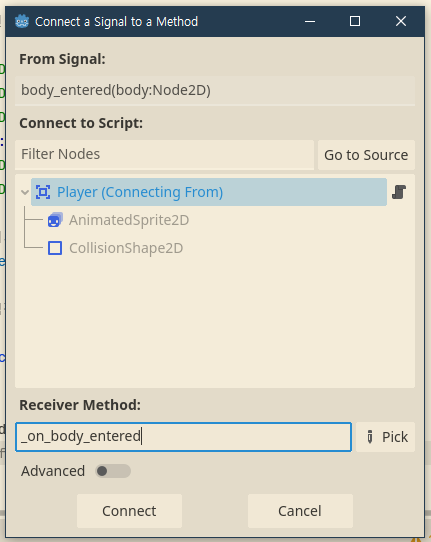 사진 속 body_entered(body: Node2D) 부분에 오른쪽 마우스를 클릭하고, Connect를 눌러주자.