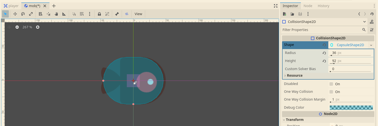또, 잊지 말고 collision 설정도 해주도록 하자. CollisionShape2D에 New CapsuleShape2D를 지정해준다.