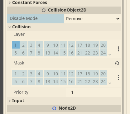 또한, rigidbody2D 바로 밑의 CollisionObject2D 부분에서 Collision 이라 되어있는 부분을 펼쳐보자.