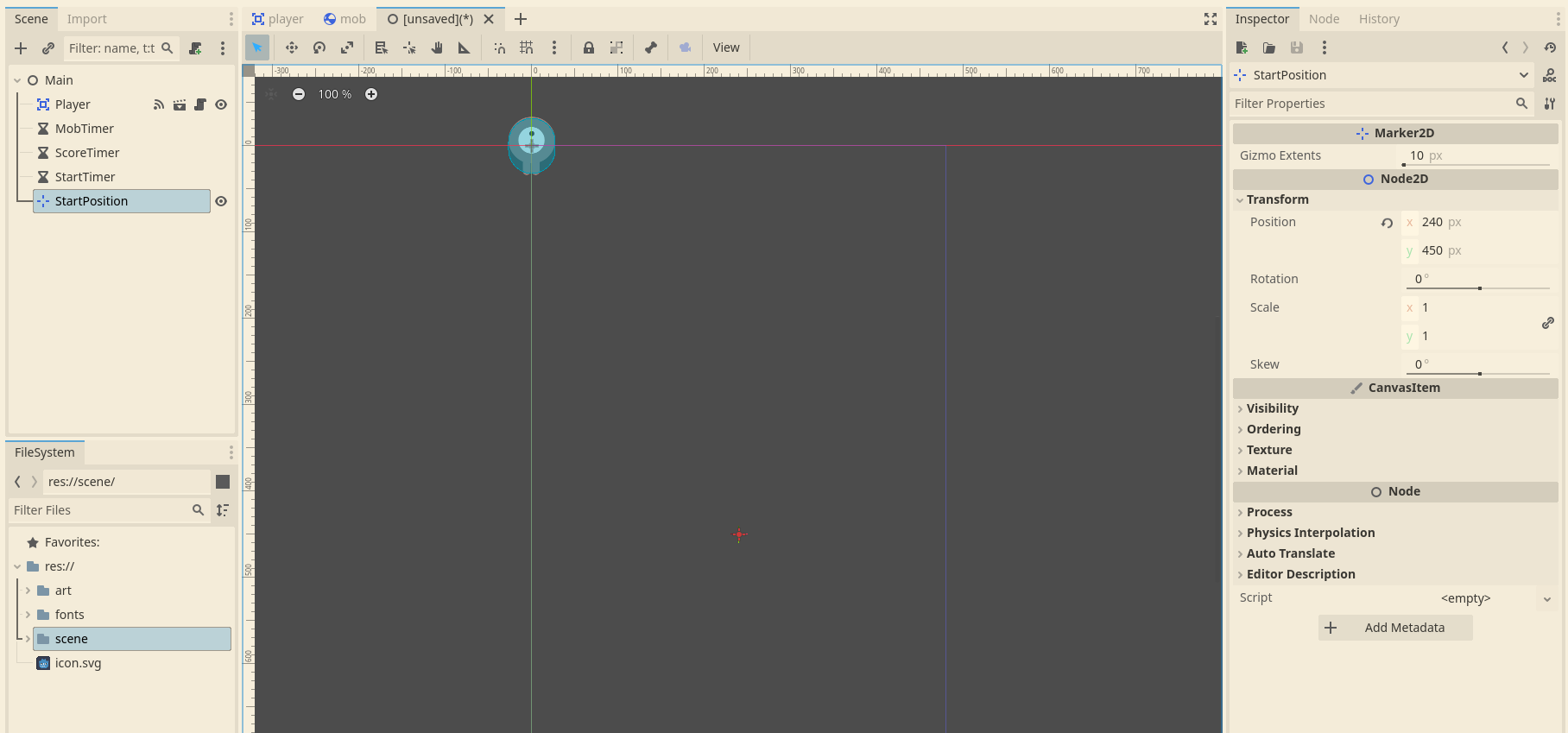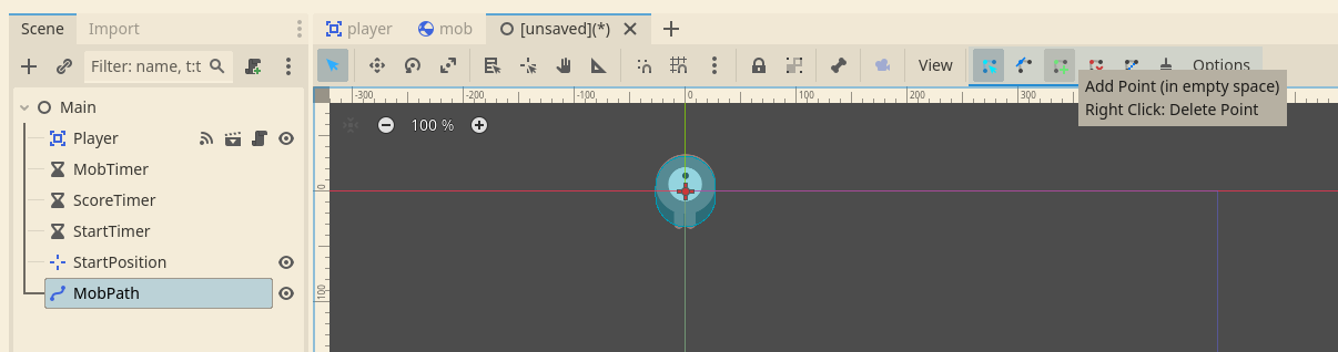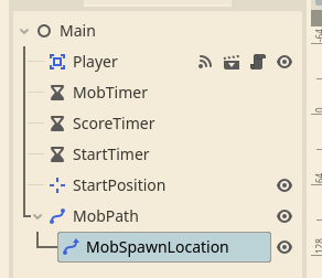 또한, MobTimer는 timeout 시에 mob 인스턴스를 만들고, Path2D의 특정 위치를 시작지점으로 한 뒤, mob을 움직이는 것까지 작동하게끔 만들 것이다.