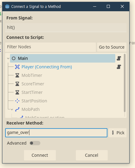 player.gd의 시그널 중 hit()을 오른쪽 마우스로 클릭하고 "Connect..."를 선택한다. 우리는 해당 시그널을 game over 용으로 사용할 것이므로, Receiver Method를 game_over로 변경해 준 뒤 connect를 눌러 마무리한다.