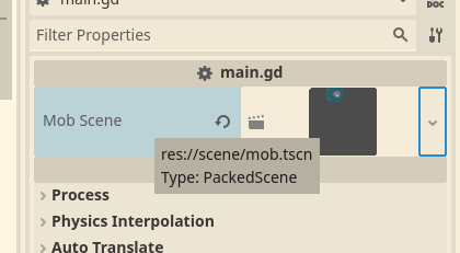 여기에 우리는 mob.tscn을 등록해 주자. (참고로 에디터 내에서 드래그 앤 드랍으로도 지정해 줄 수 있다)